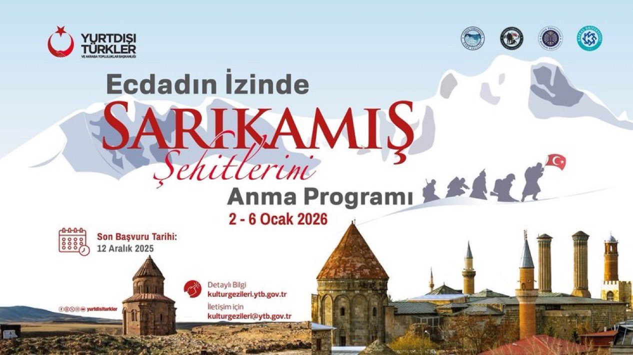Yurtdışı Türkler ve Akraba Topluluklar Başkanlığı tarafından 2-6 Ocak 2026 tarihlerinde Kars ve Erzurum’da "Sarıkamış Şehitlerini Anma Programı" düzenlenecektir.